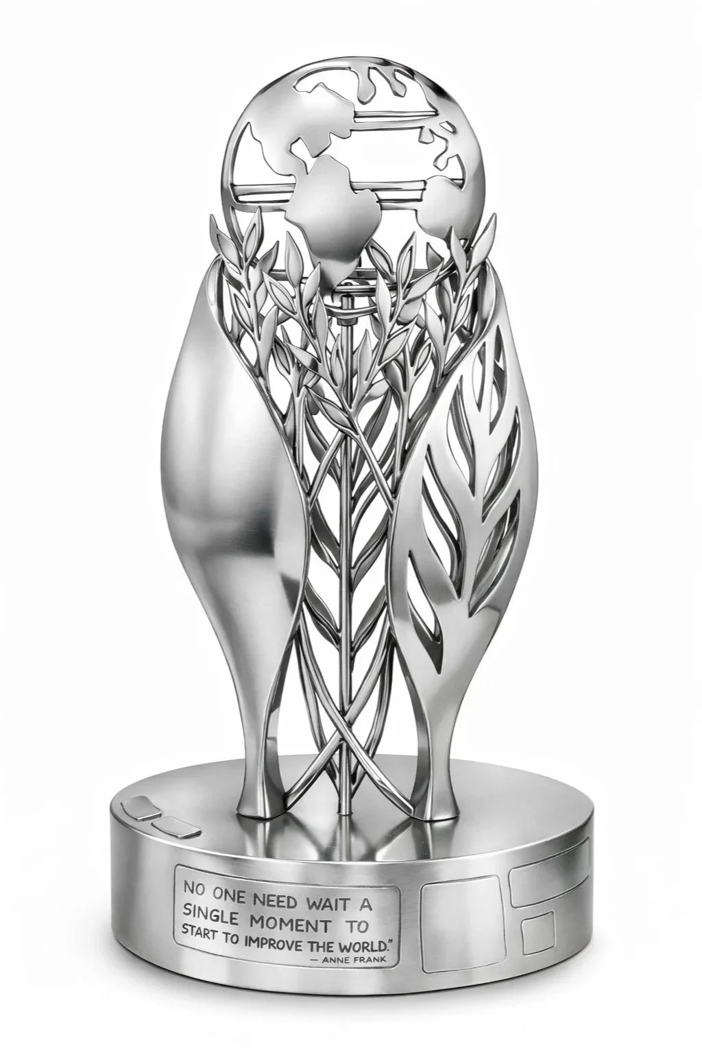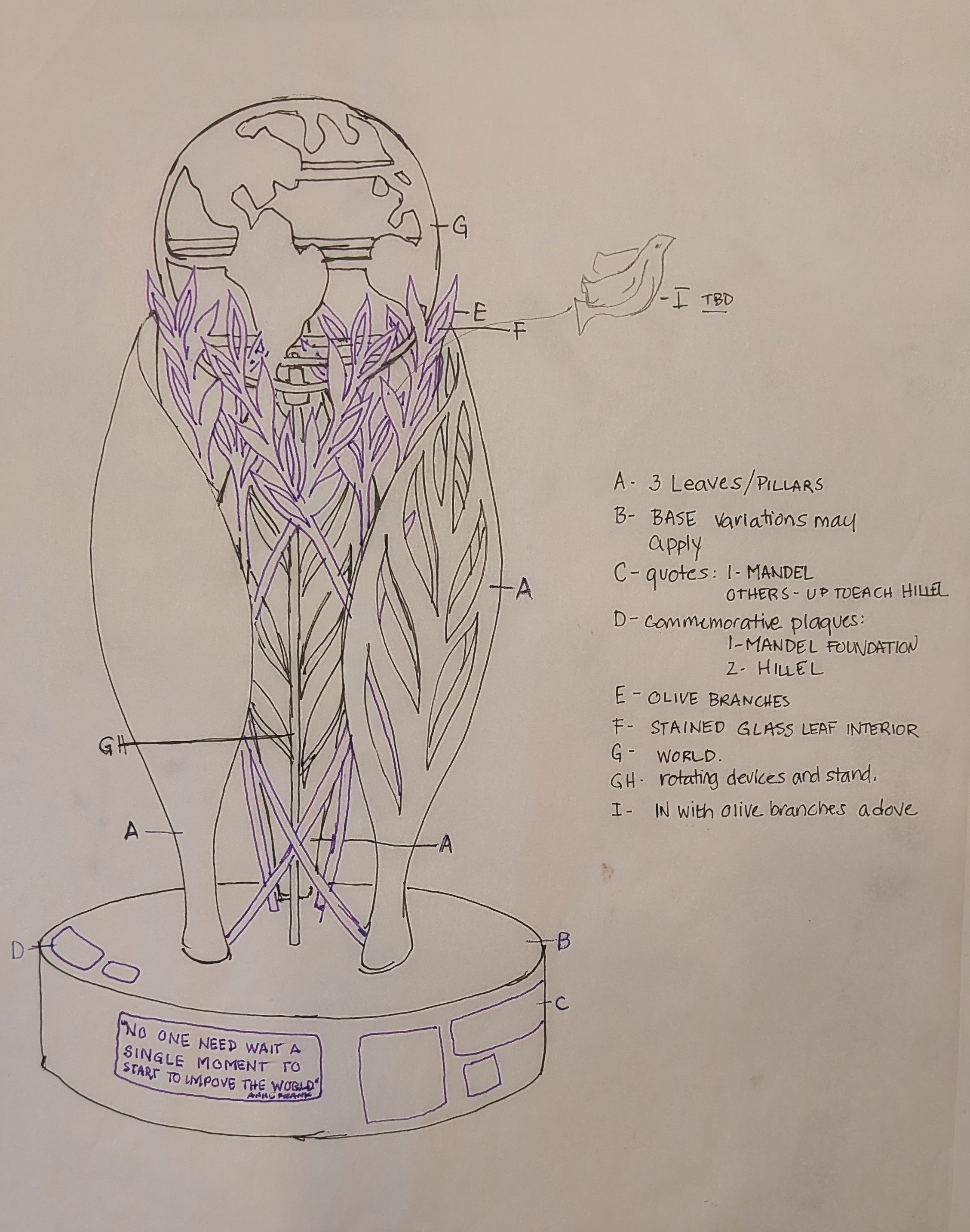 Three leaf-like pillars reference the foundations of Jewish life; Torah, Avodah, and Gemilut Chasadim, while cascading olive branches symbolize students themselves: learning, growing, and moving forward. A stained glass element on the leaves catch the light, suggesting flame, hope, and continuity. A open, wind-turned globe at the top reminds students of their role in shaping a better world.