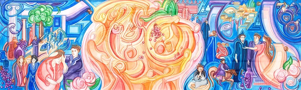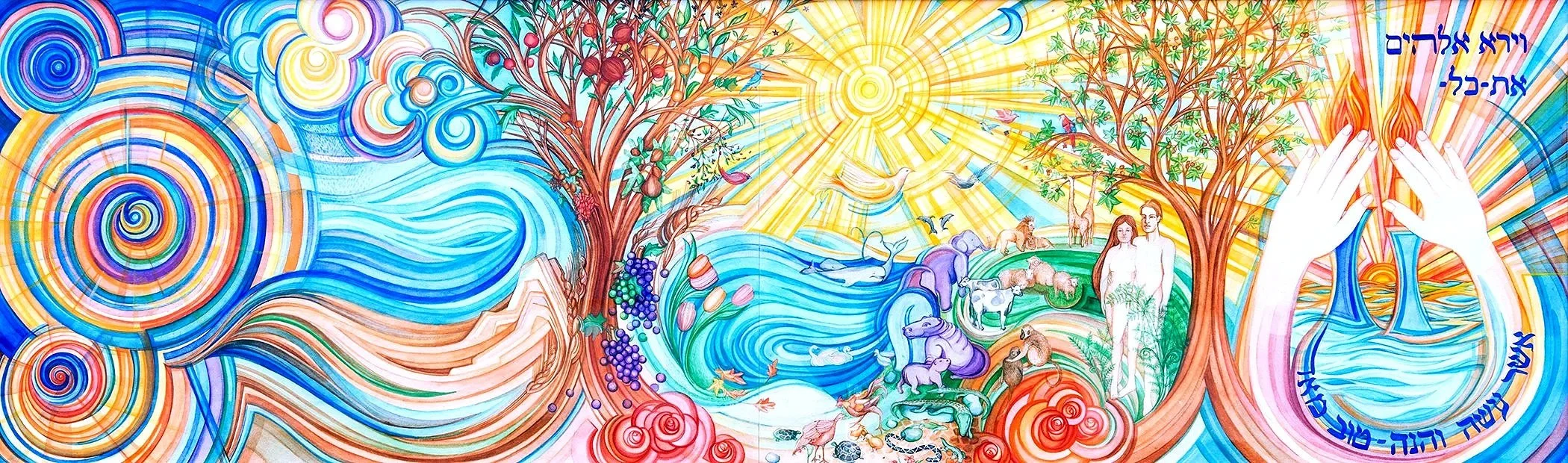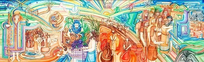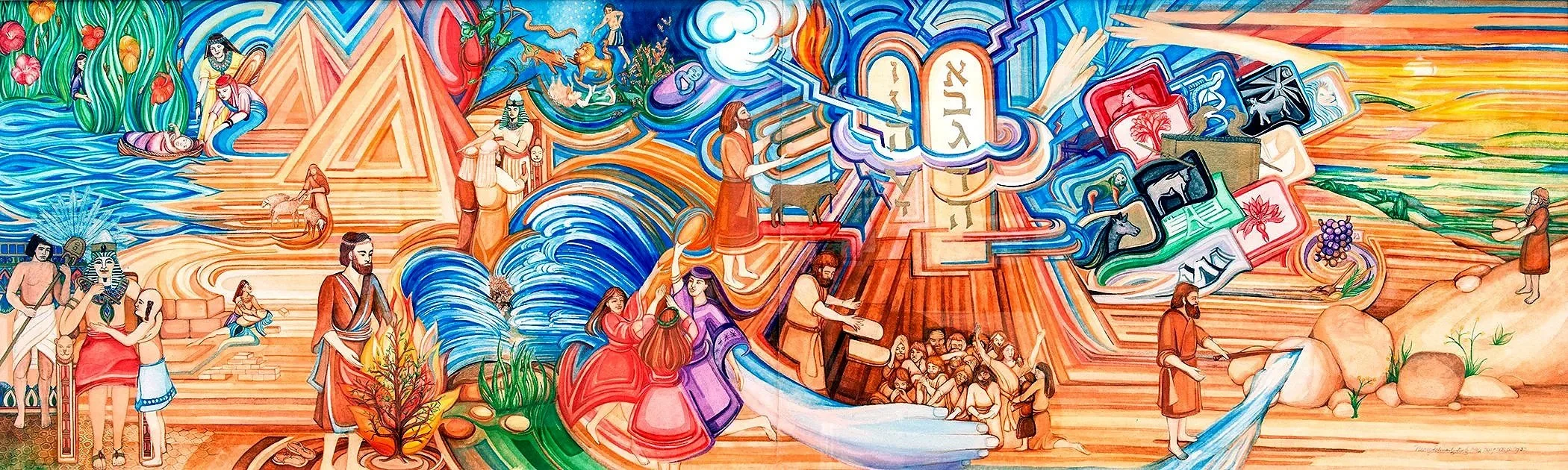 The four panels explore Creation; how we came to be; Moses; our laws; Joseph; how we live; and Esther; how we survive. Through layered color and symbolism, each story highlights its central theme while allowing quieter details to unfold over time. Elements such as the Four Species in Creation, the unfolding narrative of Moses, the tribal symbolism in Joseph, and the celebratory movement in Esther invite viewers of all ages to engage and learn in these enduring stories